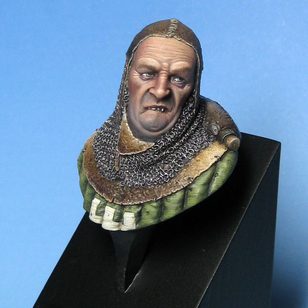 I have tried to paint a number of different textures on the model – the mail, his flesh, the leather and the quilted armour. It was quite a lot of fun to do – there have been some queries about the accuracy of the highlight on the leather bit below his chin, but I like the way it frames his face… so lets call it ‘artistic license’!