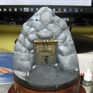 Last weekend I started to slap some paint onto the base. I have blocked in the main shadows/highlights on the cliff face and started to work on the huge ornate and now brass door. There is going to be some serious weathering and verdigris on the door and scorch-marks on the surrounding cliff.