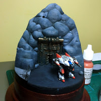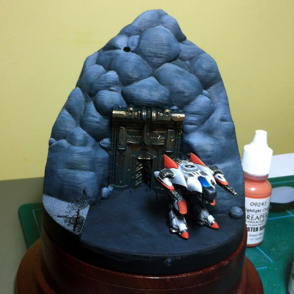 This is a really quick mobile phone photo… The colour is shot to pieces on the cliff face, but it gives you quite a nice view of the contrast between the Enyo siege walker and the natural surroundings. The colour of the previous photo was much more accurate… this one has a strange green cast over it – the back wall should be yellow.