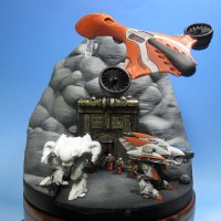 I managed to get some good painting time on the dropship as well. I opted for a reverse of the colour on the walker – orange with white details rather than white with orange. There needs to be some more white on there to balance it out, I am thinking of painting the chevron-shaped section at the back white.