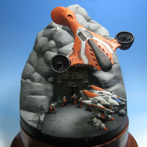 I managed to get some good painting time on the dropship as well. I opted for a reverse of the colour on the walker – orange with white details rather than white with orange. There needs to be some more white on there to balance it out, I am thinking of painting the chevron-shaped section at the back white.