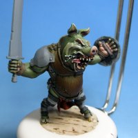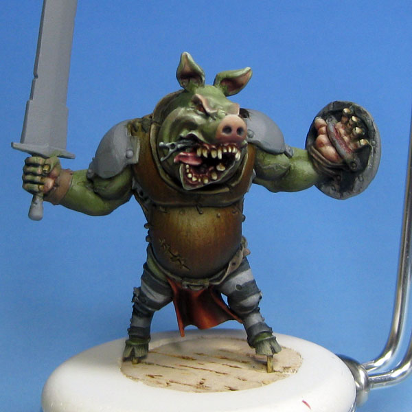 Whilst on the topic of unconventional, I decided to paint this pig-man like an old school AD&D pig faced orc – so green rather than pink – and I am pretty happy with the way it is turning out. The sculpting and casting of these models is superb – certainly in the resin, but be warned, apparently they are limited run. According to the CMoN store, the resins are “Available now in limited quantities only until Gencon Indy, August 2012.”