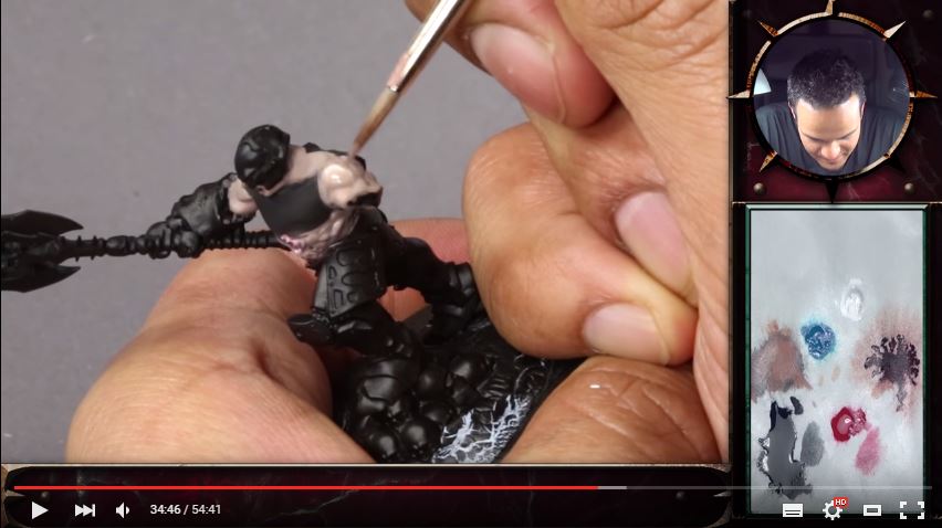 Other than the innovative techniques used, one of the great things about these vids is the 3 camera setup. At all times, the pallet, the miniature and the artist are visible. This allows you to very easily see the consistency of the paint and how it is applied to the model. It also helps really engage with the artist as the explain the decisions they are making and makes you part of the whole process.