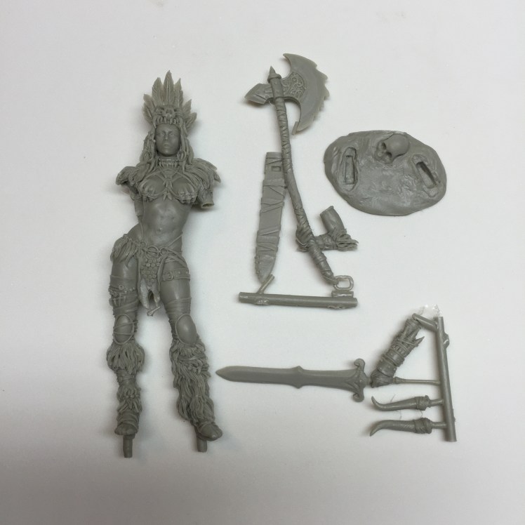 The final kit I’ve got is “Savage Beauty” – a beautifully detailed Amazonian warrior. Out of the three kits, this one is the most finely detailed – so many different textures and materials from fur to feathers and metal to leather there is so much that could be done with this miniature.