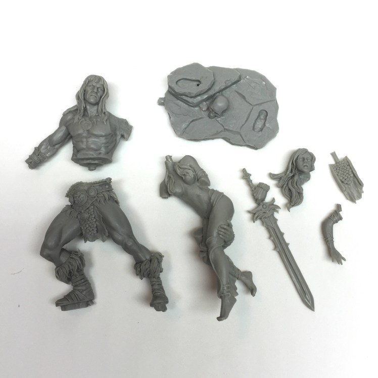 More pieces involved in this kit, 4 pieces to the barbarian (upper body, legs sword hand and rear cloth), three pieces to the princess (body, head and left arm) and the base. Both faces have great features with a lot of character and will be a lot of fun to paint – especially trying to differentiate the colour of the flesh of the barbarian to that of the princess.