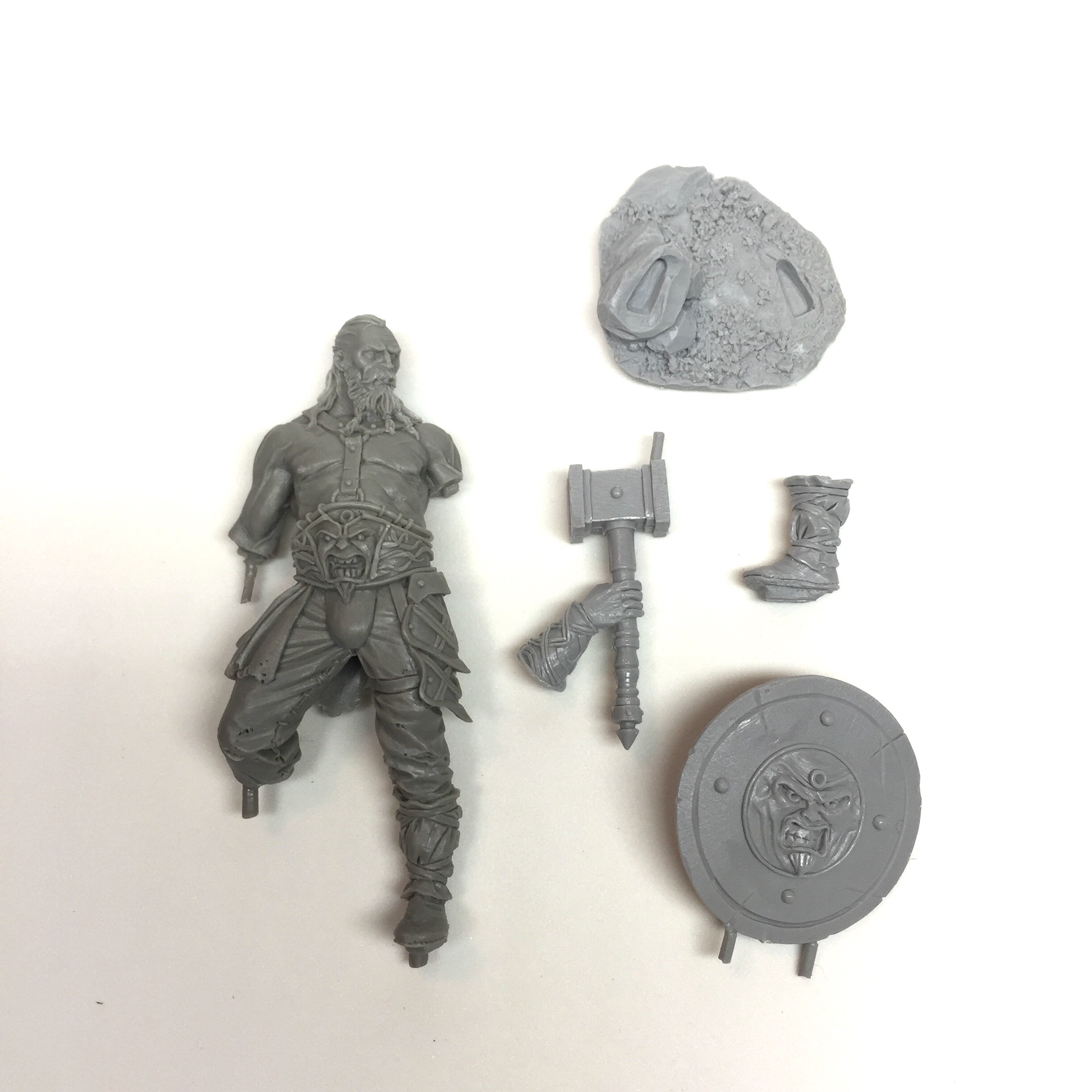 There are 5 parts to the old barbarian – his main body, shield with forearm, hammer hand, lower leg and a base. All of which are beautifully sculpted with enough detail to make this a great little painting project. Things that really caught my eye with this miniature are his fantastic face, his posture and the way his physique really emphasises his age