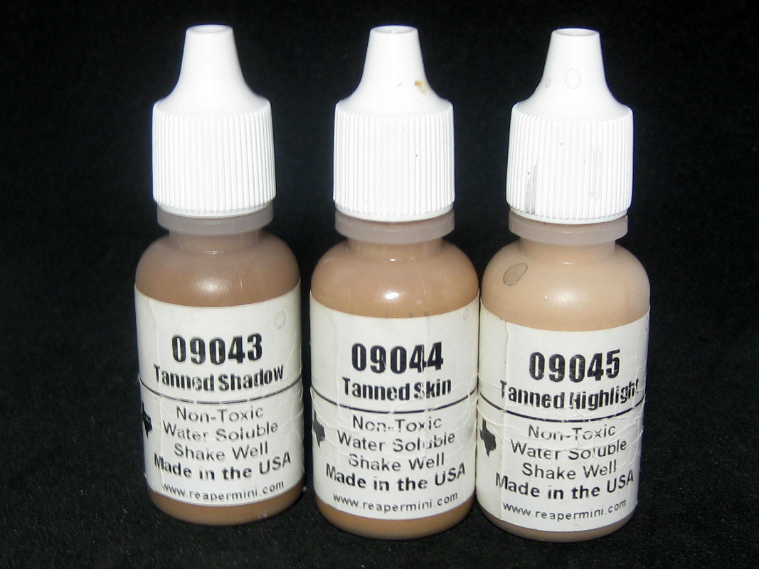 The first step is to get a good even coverage of Reaper Tanned Skin (the middle paint in the triad). In this instance, I used my airbrush to get an even coat very quickly. You could easily do this by hand with well diluted paint, in a number of layers – making sure to let each layer dry before applying the next (a hair dryer can be really helpful in these situations).