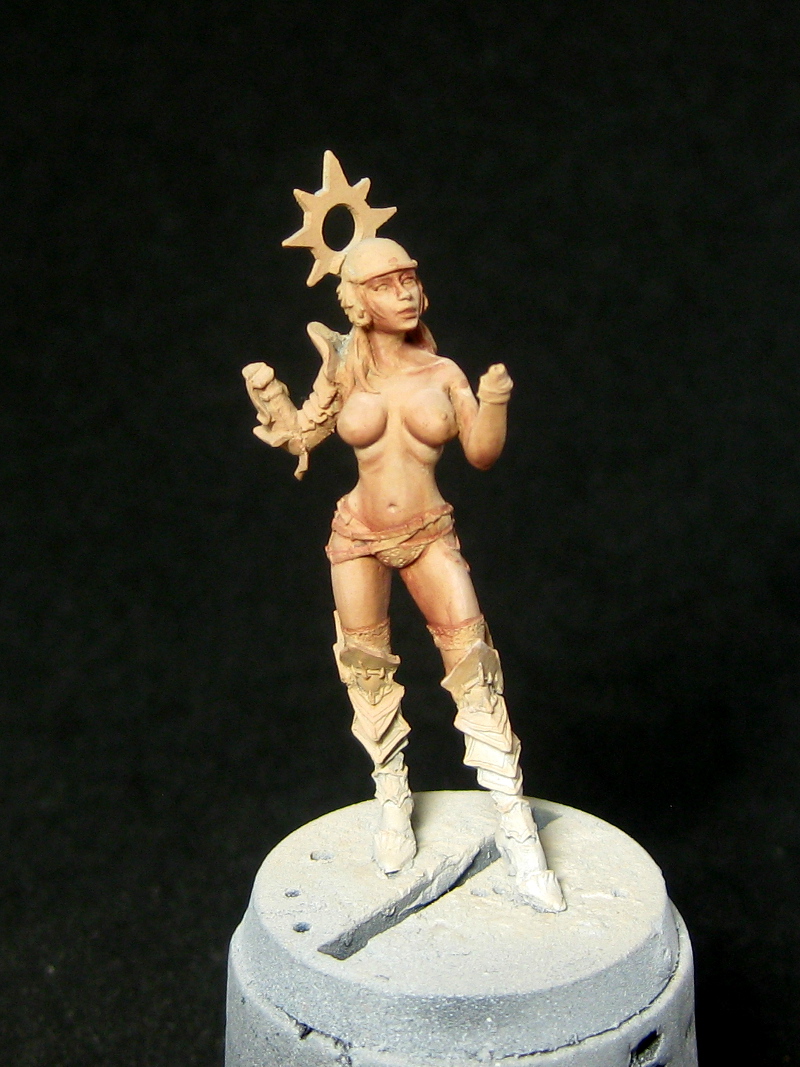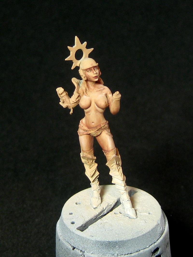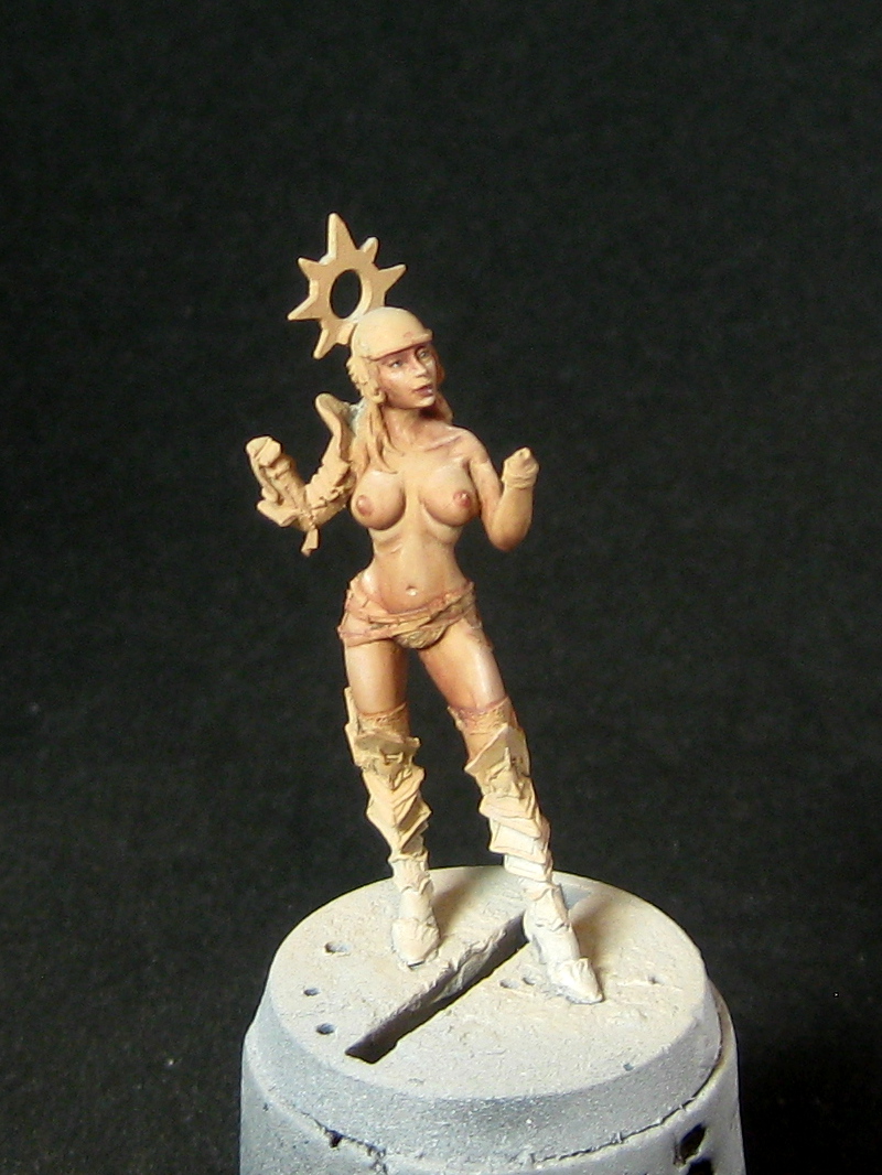 Then, using paint I still had on my pallet, I painted in some of the details – her eyes were painted in with the Ivory mix, with Coal Black pupils; her lips with Sanguine Base highlighted with Carnal Pink; and her nipples were painted in Dusky Flesh highlighted with the Ivory/Tanned Highlight mix.