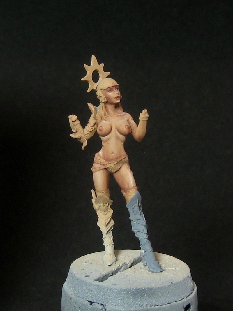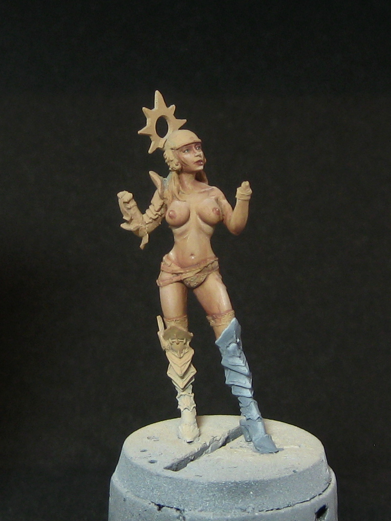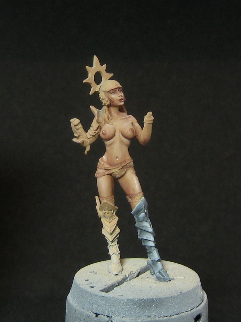 After painting her flesh, the next most significant area of the model is her armour, which as you can see from the artwork is a dark steel colour with gold trim. This part of the tutorial series is a step-by step focusing on painting non-metallic steel on the armour of her left leg.